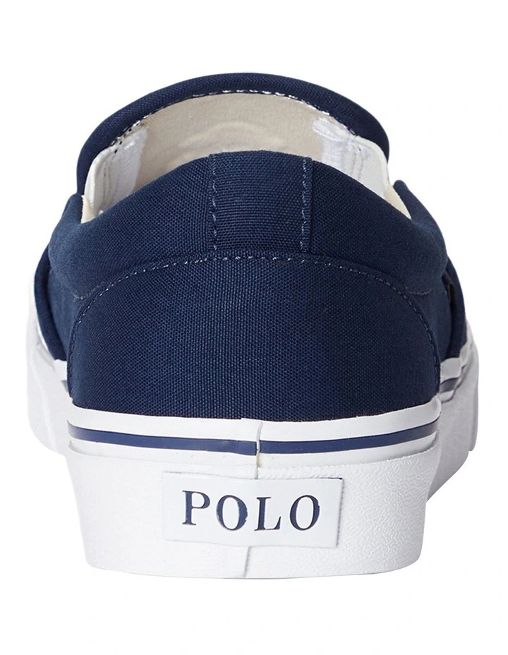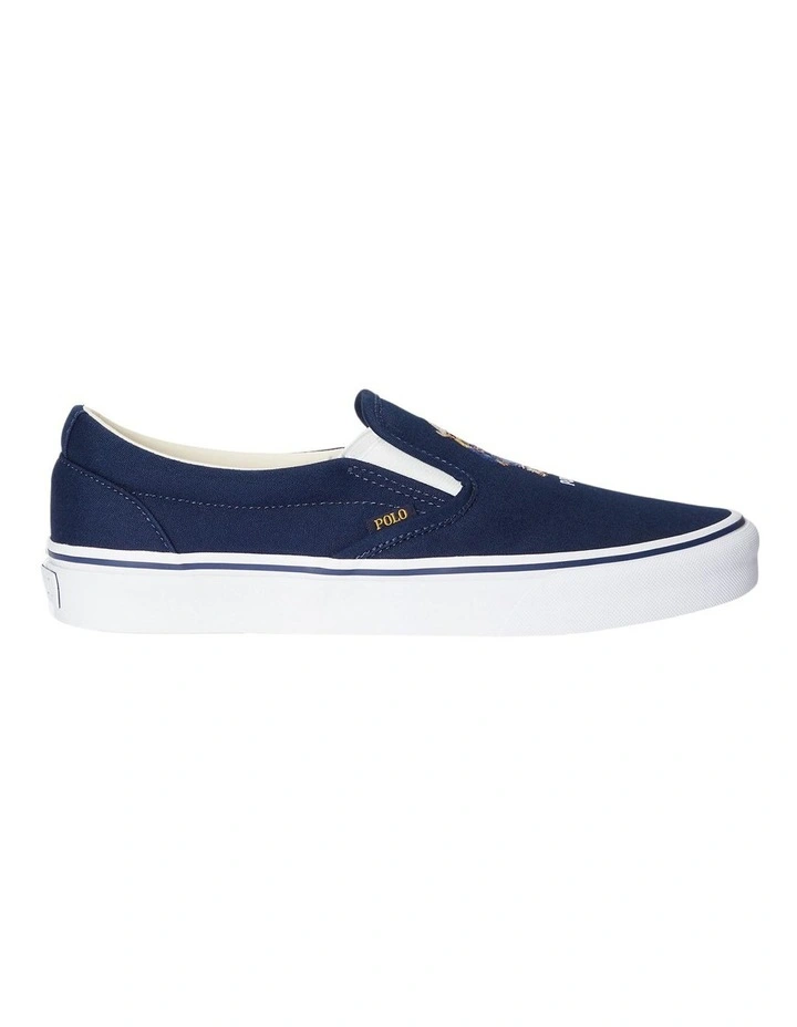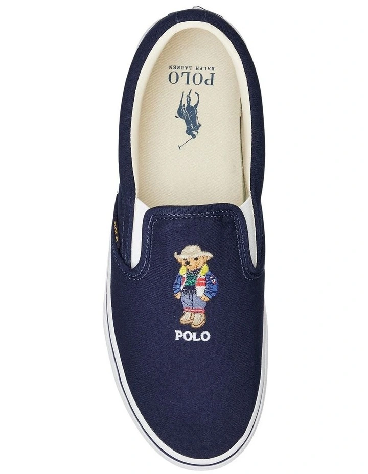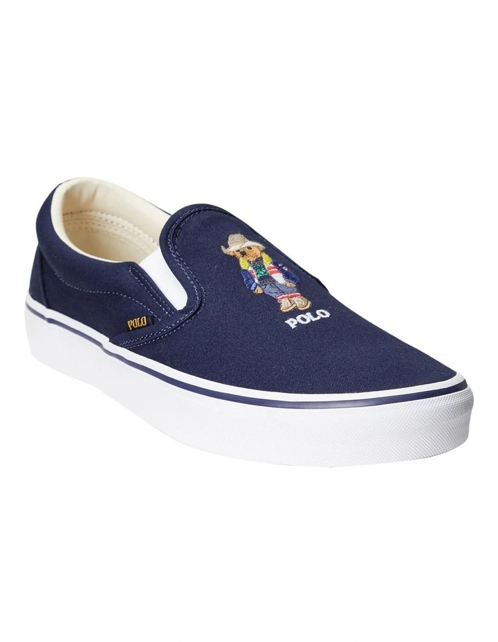 The world’s best-dressed bear accents the top of Polo’s classic slip-on sneaker. Rendered in cotton canvas, it features an updated EVA footbed for comfort with every step.