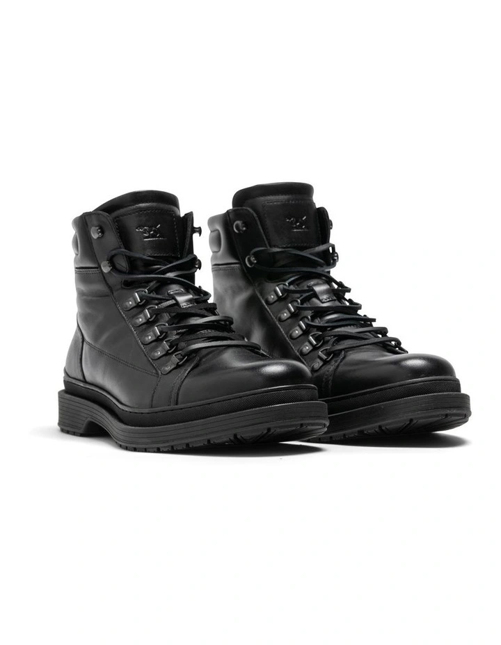The Alpine Trek boot is crafted in Portugal from soft bovine leather, lined with fabric and is stitched to a flexible rubber sole. The “lace to toe” styled boot features D-ring trims and a natural leather lace.