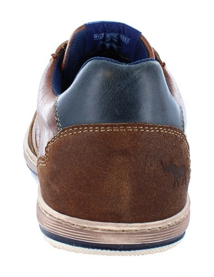 This Wild Rhino Sneaker features a tan leather upper and contrast blue laces.